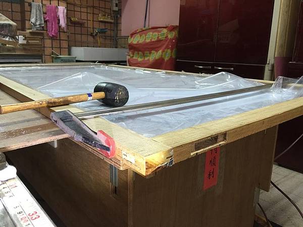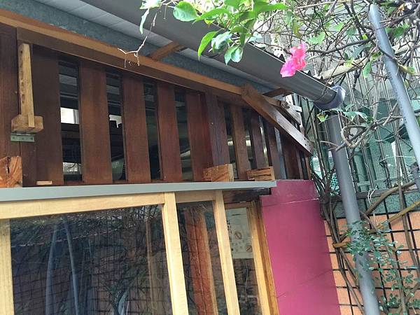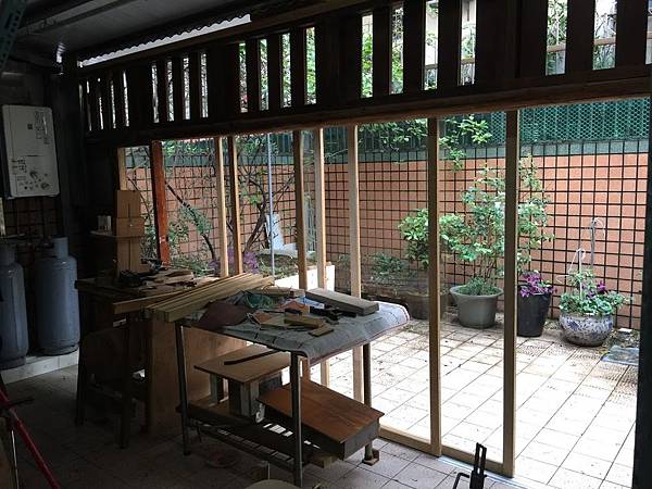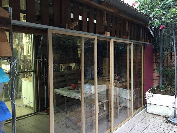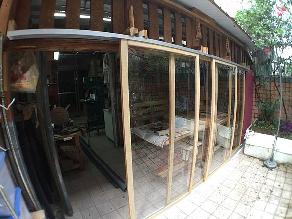 利用假日替工作室做落地窗/拉門。採用低軌軌道,避免踩踏跌倒。利用榫接工法做了4個拉門,鎖上一字輪,好推拉。鑲透明PC板,終於可以遮風蔽雨了。加上排水系統,太完美了。